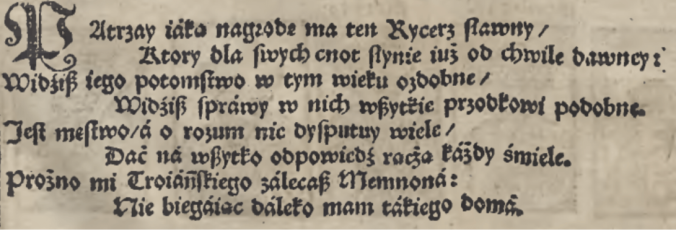The piece is roughly based upon an extant piece of Polish poetry from 1578, which speaks of how (from the description) “The virtuos founder should be proud of his successors, and there is no need in wanting to be like the legendary hero[Memnon], when you have such a house, the house of Pobóg.” I discovered this piece in a translation discussion, which unfortunately did not have the original source or author listed. I am not even sure if this piece was an individually titled work, or if it was a part of a larger body of work.