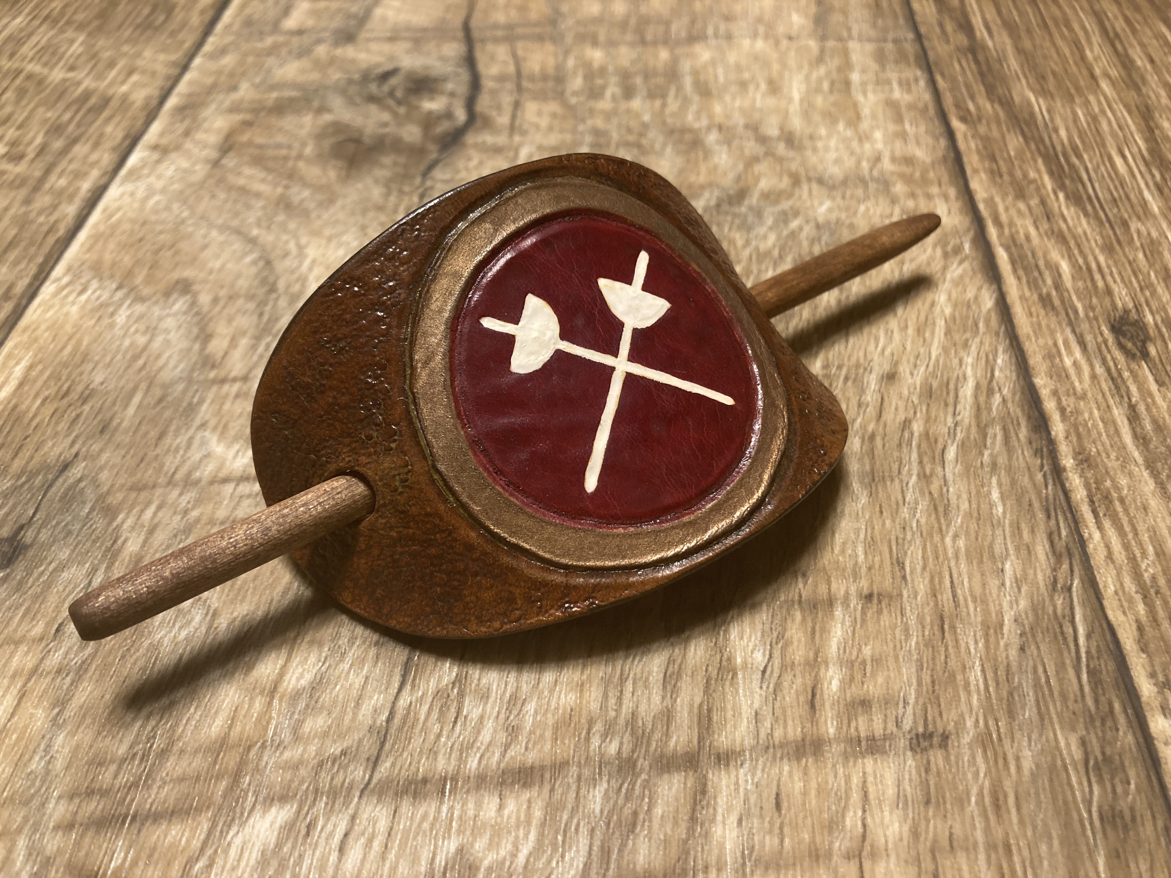 When word started to spread that my cadet-sister Maebhbh Ni Manainn was getting very close to her bronze ring, I wanted to make something special for her. Knowing that she loves her hair accessories, and fresh from finishing the Mingolian Dragonscale Quiver for my warder, I kept with the leatherworking momentum and decided to make her an Order of the Bronze Ring hair stay.