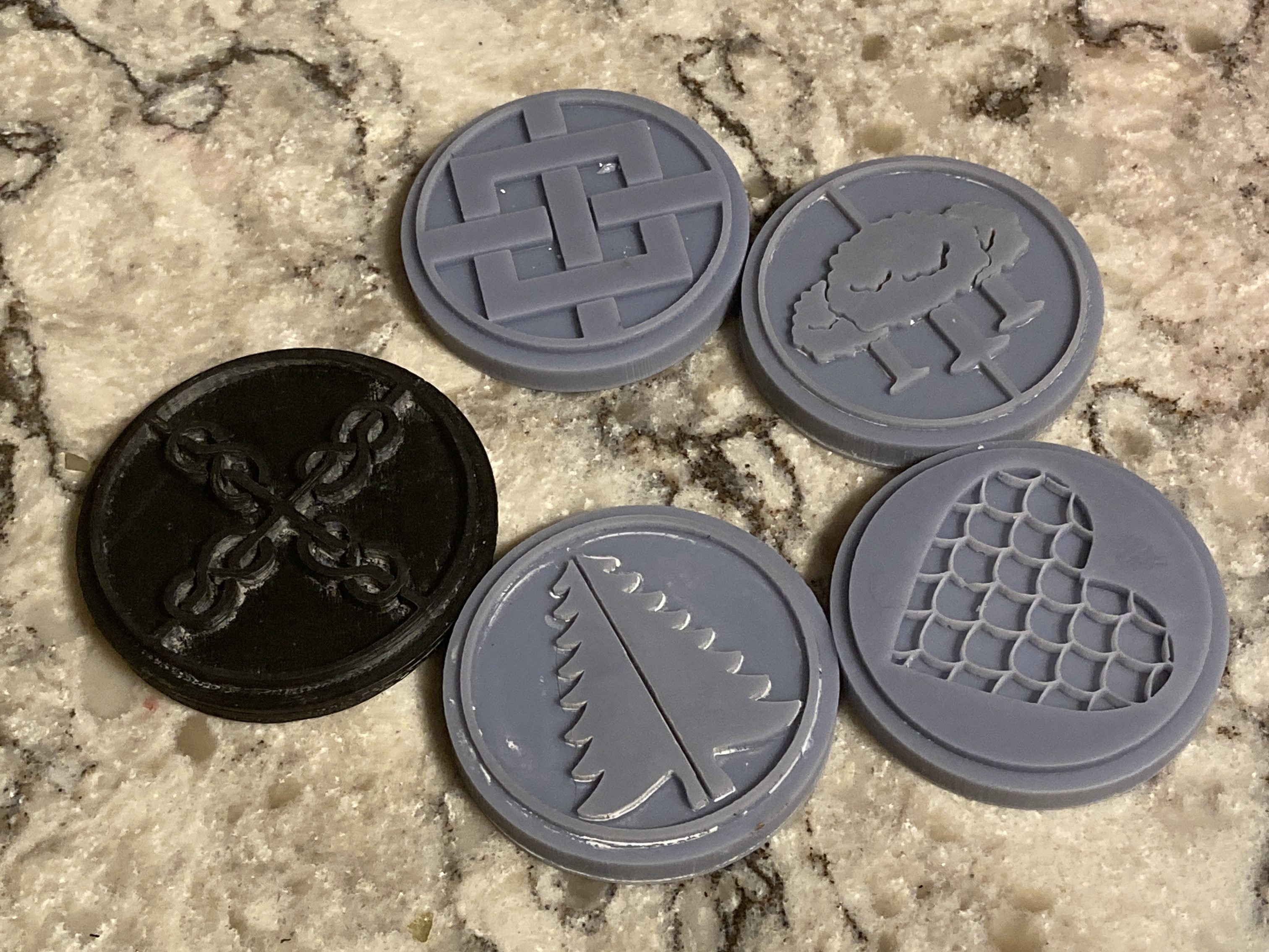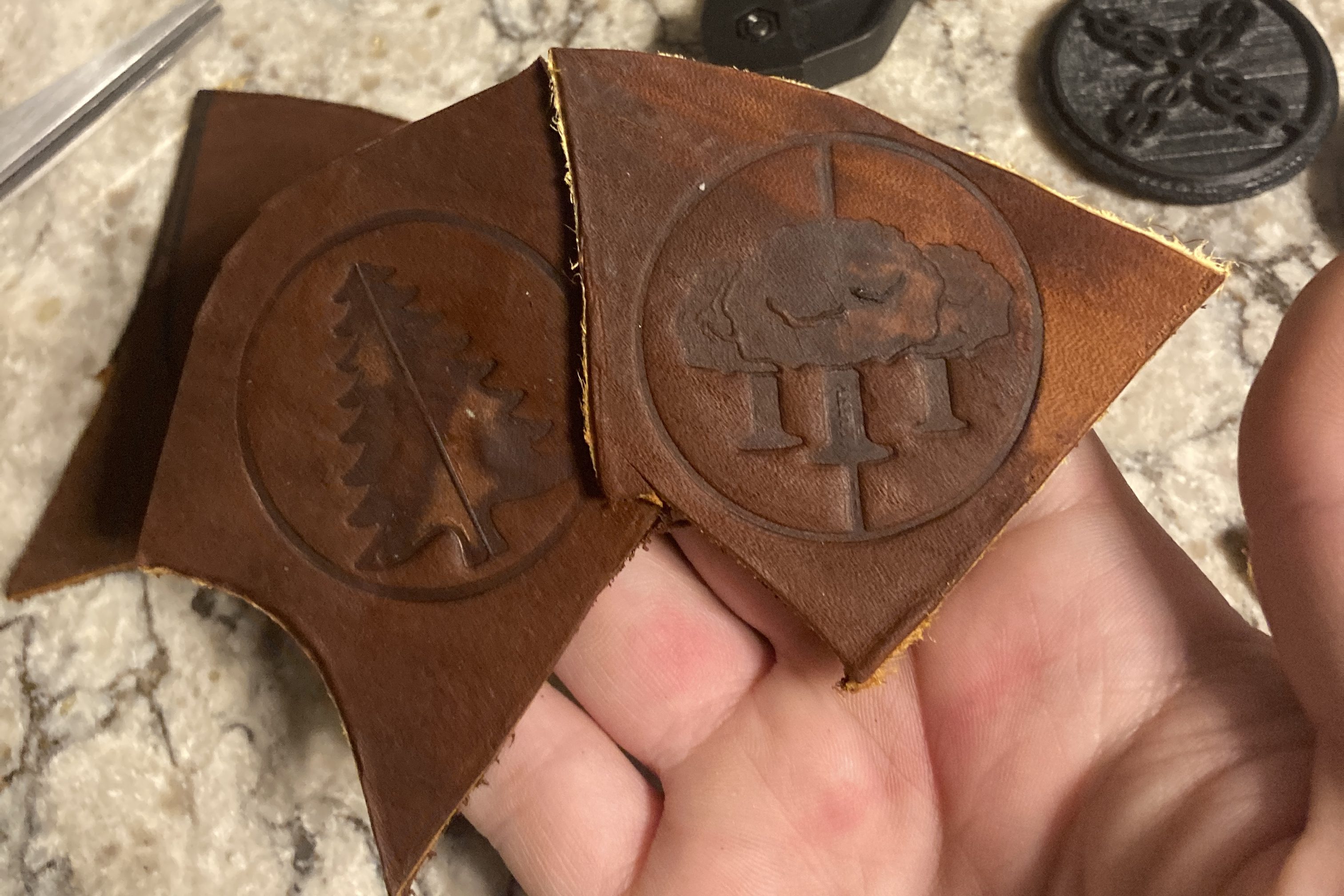 The medallion patterns are embossed using custom stamps I modeled and 3D printed (stamp overview & coming soon). A tremendous thank you to Tali Essen of the Isles for the high-resolution award graphics, which saved a fair amount of time in modeling the award stamps.