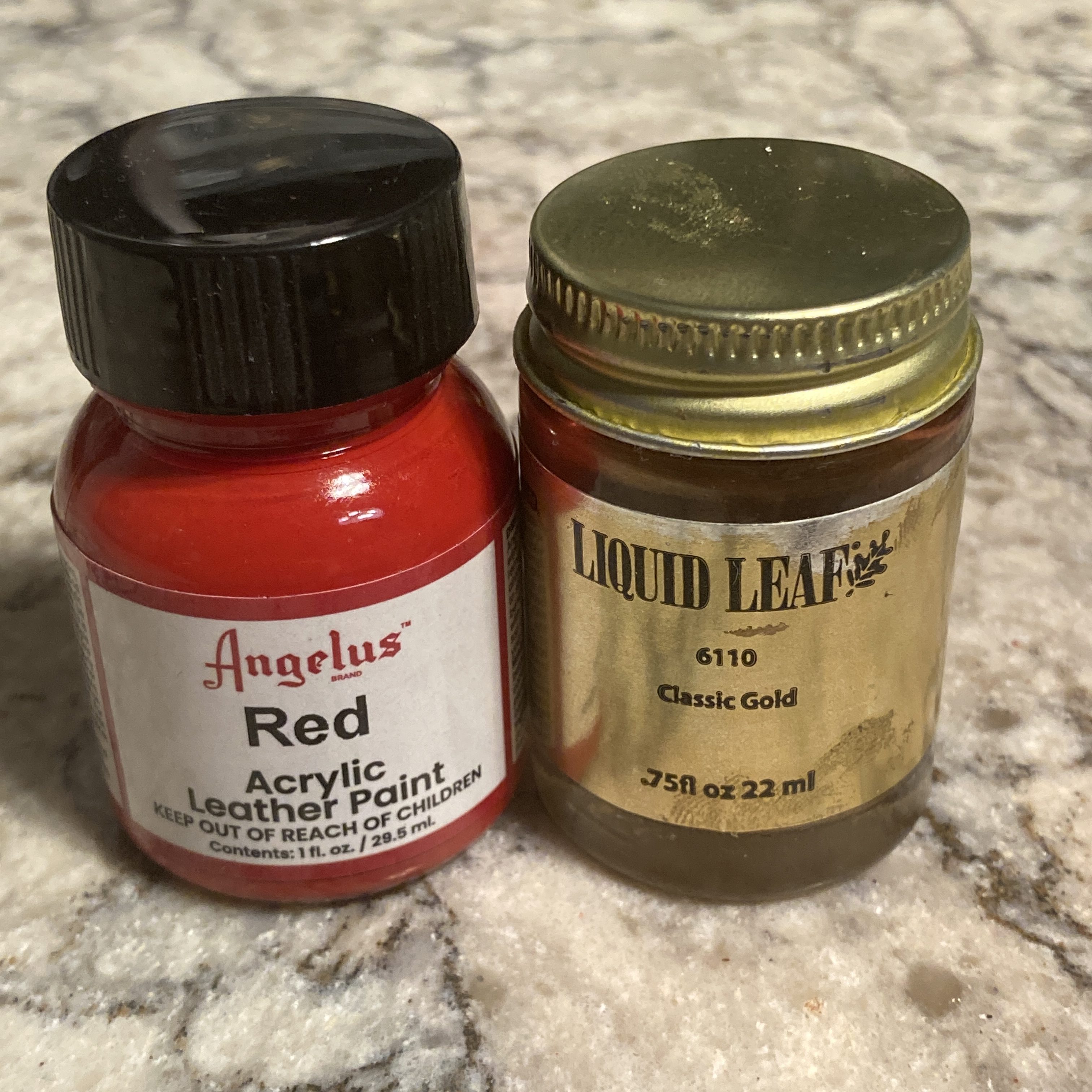 For any paint work on leather, I like to use Angelus brand acrylic leather paint for all colors, and a brush-on leaf for metallic tones.