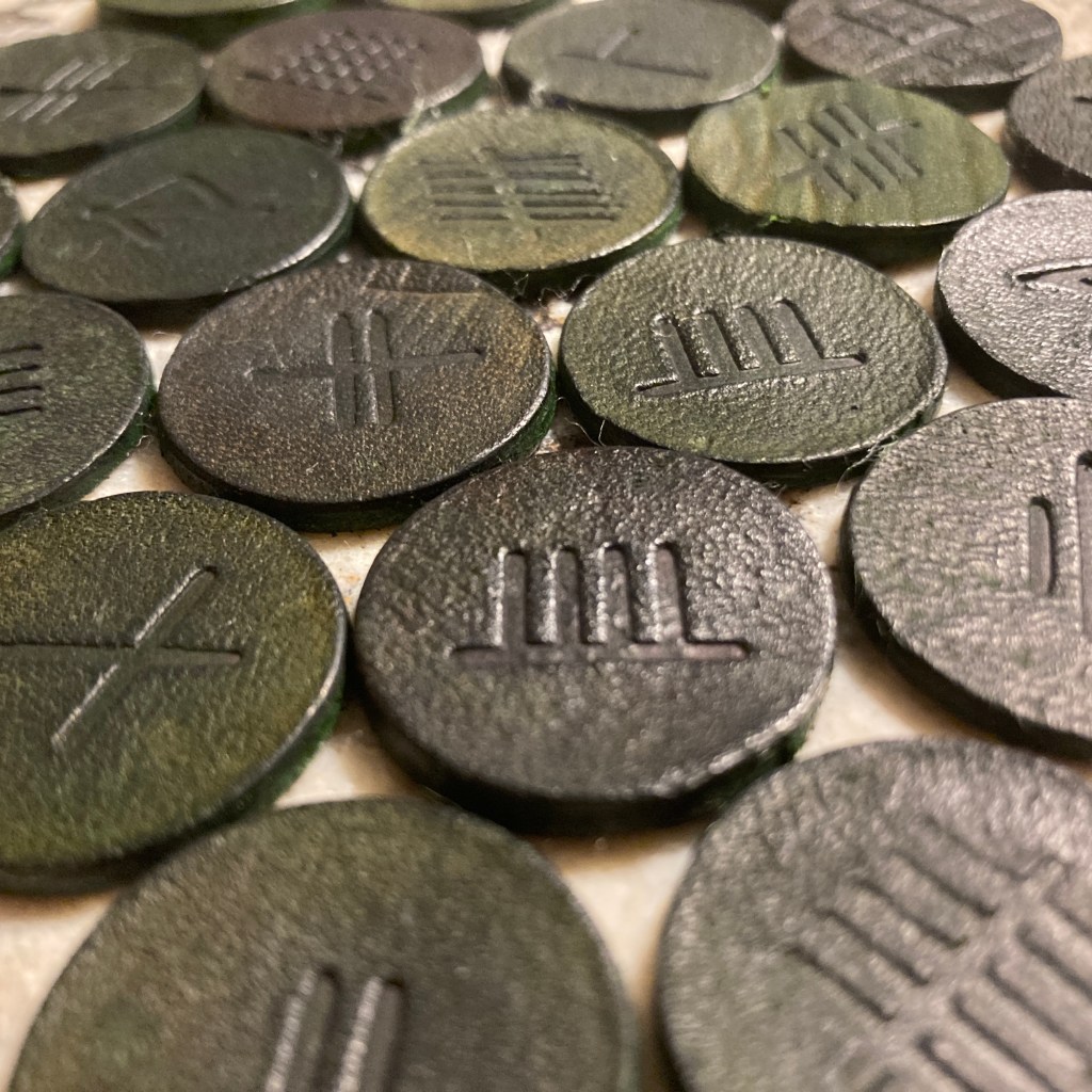 One set was done in Elder Futhark, an iconic norse/proto-germanic script and one of the oldest runic scripts in the world (estimated to originate in the 1st century AD). Once stamped, the disks were rubbed with dark brown antiquing gel to give it a deep two-toned look.