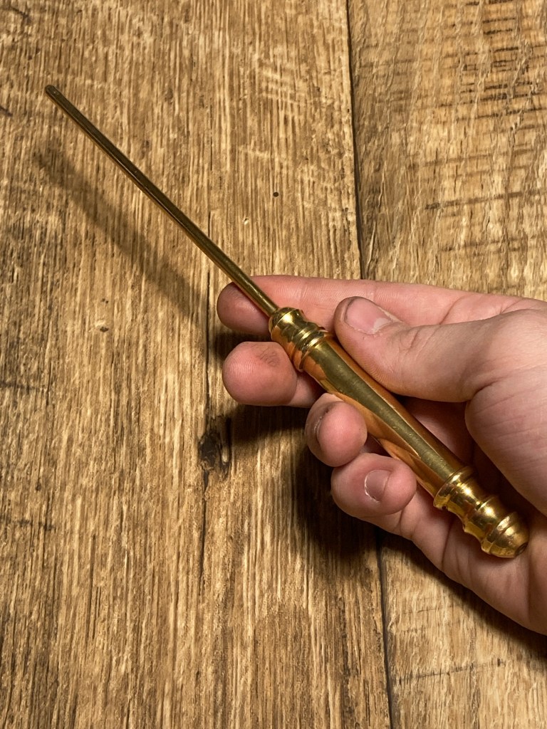 There are two main wands that I use when performing, a traditional magician’s wand, and this tapered design more reminiscent of a wizard’s arcane focus (which I made out of a candle snuffer).