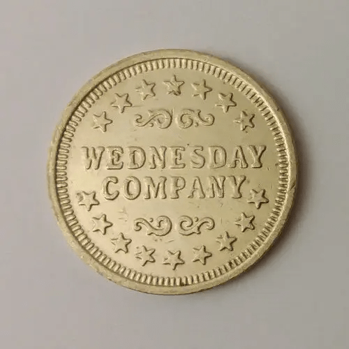 The design features the “No Cash Value” from the original arcade tokens on one side, and the WedCo checky (found on their iconic cloaks) on the other.